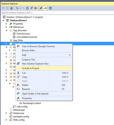 Find the zip file you downloaded earlier and copy the contents in to your project folder (the folder containing the .csproj file). Overwrite all existing files. This will install Umbraco's binaries, configuration files, razor templates, Back Offic, Angular JS, CSSÂ and HTML.
